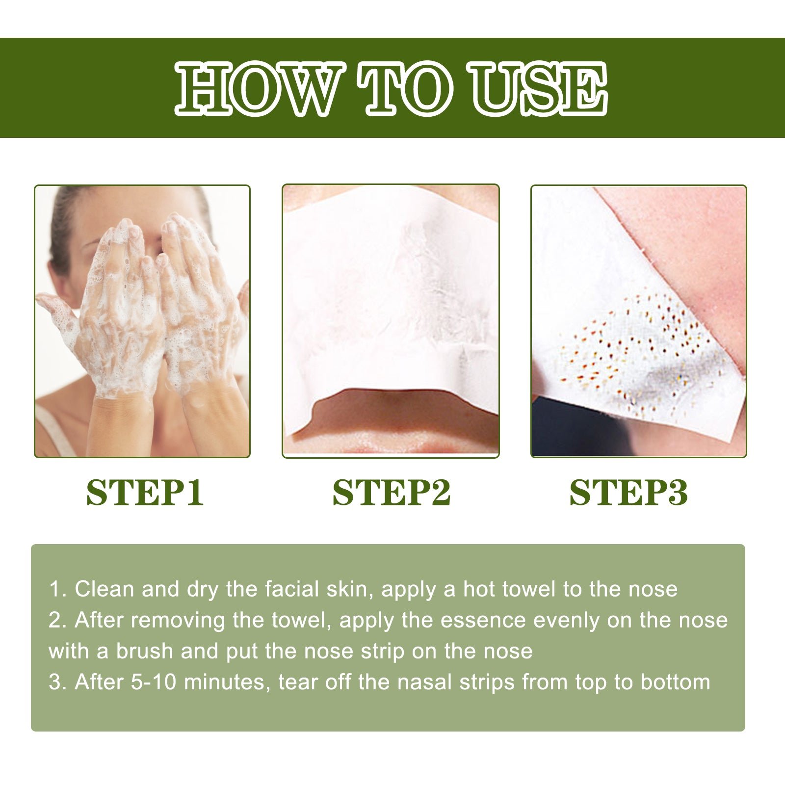 Our Blackhead Removing Serum Suit contains tea tree oil, lanolin wax and castor oil. It can gently and effectively remove blackheads and whiteheads. Refine and shrink pores, clean dirt, balance oil, effectively improve clogged pores, soothe skin, and make skin clean and smooth. The way to use it is very simple: clean and dry the face skin, apply a hot towel to the nose, remove the towel, use a brush to evenly apply the serum to the nose, and then stick the nose sticker on the nose, 5-10 minutes later, tear the nose sticker from top to bottom. After use, it helps to remove blackheads, shrink pores, soothe skin and make skin clean and smooth.