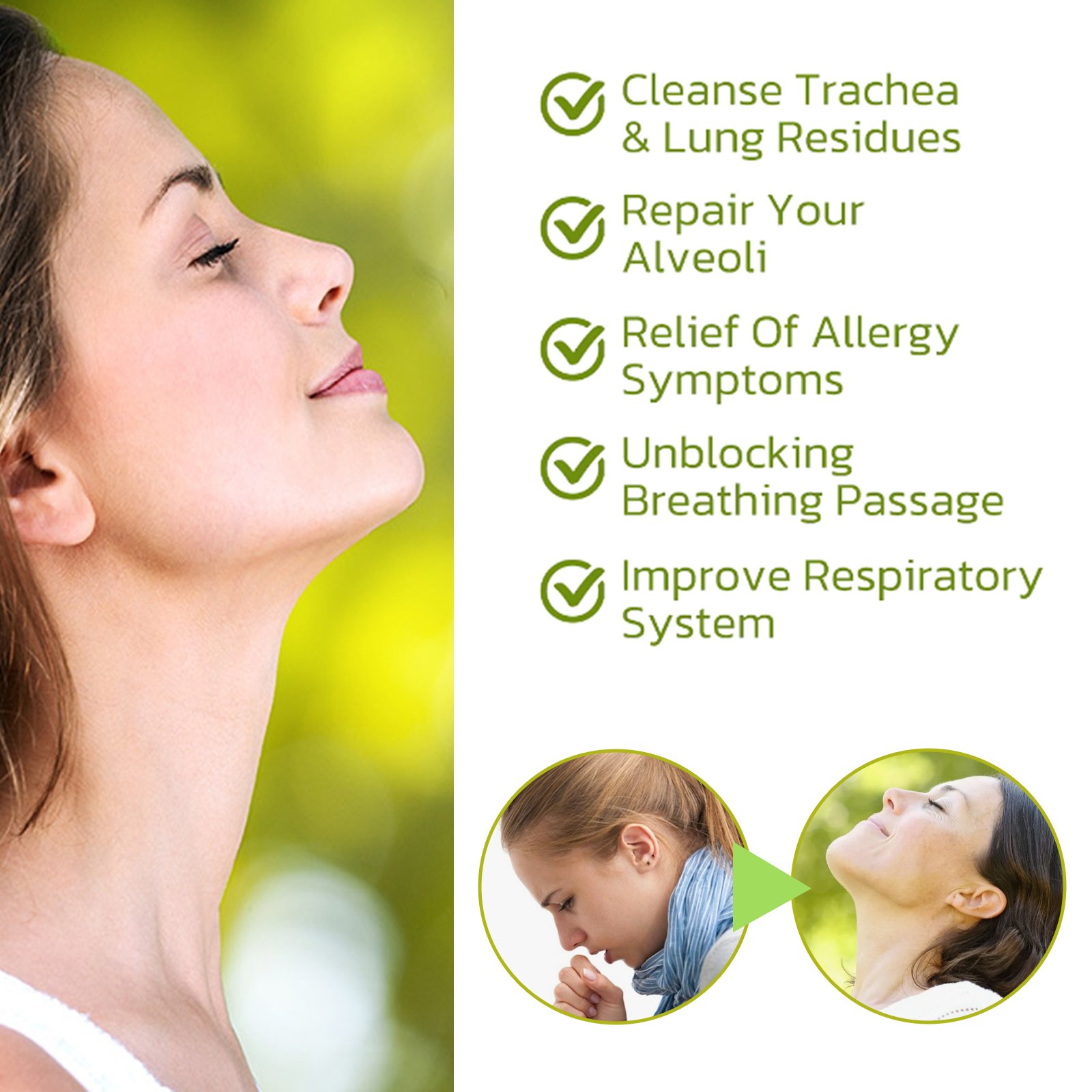 Our body care drops contain valerian, green tea extract, peppermint extract. It can clean trachea and lung residues, repair alveoli, relieve allergy symptoms, unblock breathing passages, and improve respiratory system; Effectively combat allergies/asthma, guide residual waste and sputum discharge, promote self-cleaning of the lungs, stable wheezing and chest tightness, thoroughly clean the lungs, regenerate alveolar and tracheal tissue, increase lung capacity, reduce the desire to smoke. The way to use it is simple: Shake it well before serving, 1-2 drops at a time. Body care drops can treat pneumoconiosis, regenerate lung tissue, remove lung residual fluid, and heal upper respiratory tract infections.