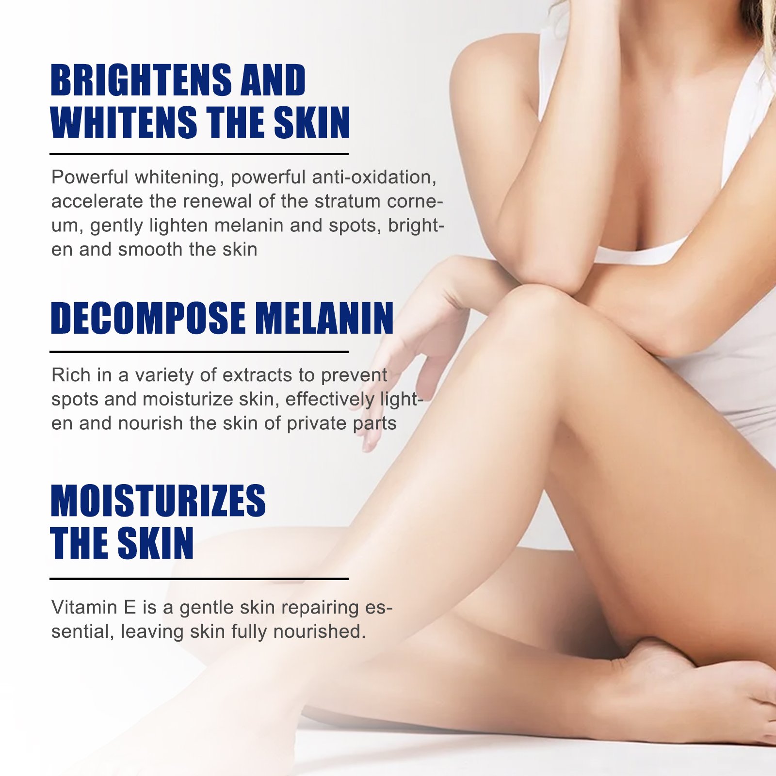 Our body brightening cream contains light carymus root extract, vitamin E, sandalwood oil. It can whiten the skin, accelerate the renewal of the skin cuticle, gently dilute melanin and stains, promote skin smooth, decompose melanin, and replenish skin moisture. Its use method is very simple: first clean and dry the private parts and surrounding skin, and then apply the appropriate amount of cream evenly on the skin, gently massage in circles with the hand until absorbed, daily use can achieve better prevention of stains, decompose excess melanin, deep penetration of the skin, nourish the skin, and promote skin more whitening and smooth.