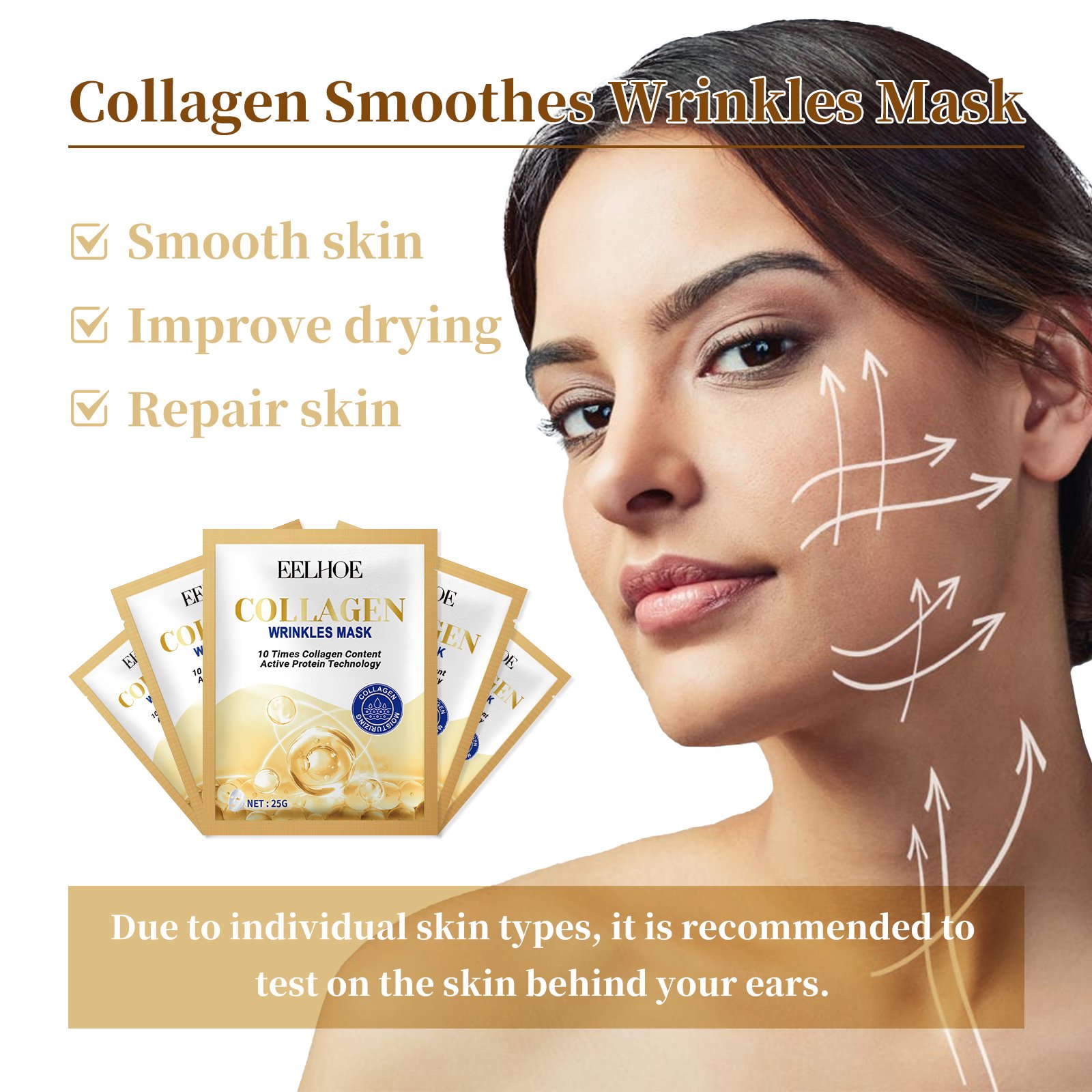 Our Collagen Wrinkles Mask contains hydrolyzed collagen, glycerin, and niacinamide. It can nourish and protect hair, but also improve the health of hair follicles, promote hair growth, castor oil can keep hair moisture, and the fatty acids in it can also supplement the natural oil of hair, protect hair. Its use method is very simple: clean the facial skin, open the bag, take out the mask, apply it to the face, gently pat until it is comfortable, relax and enjoy 15-20 minutes, then remove the mask, wash your face with water. It can effectively reduce wrinkles and make skin look younger and smoother.