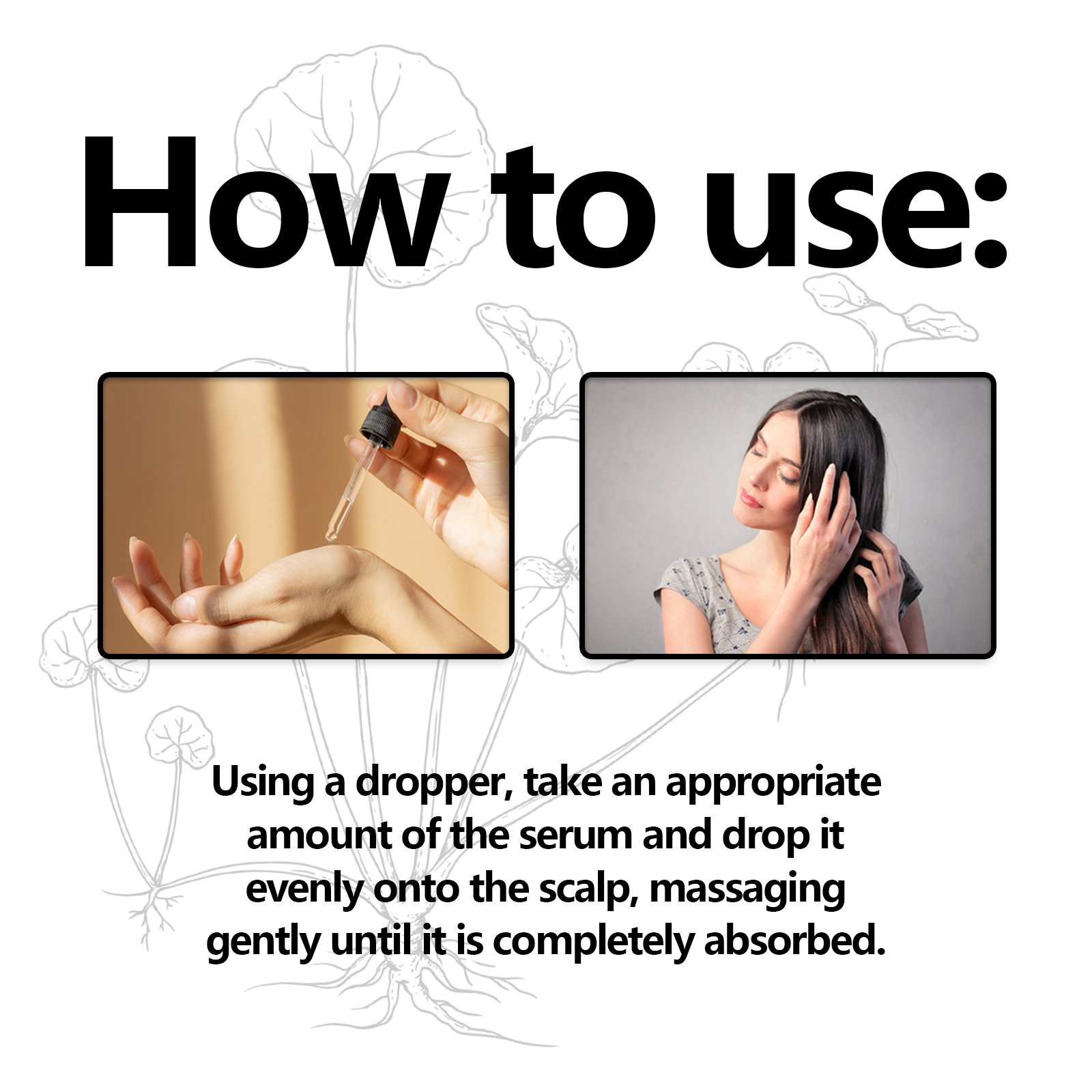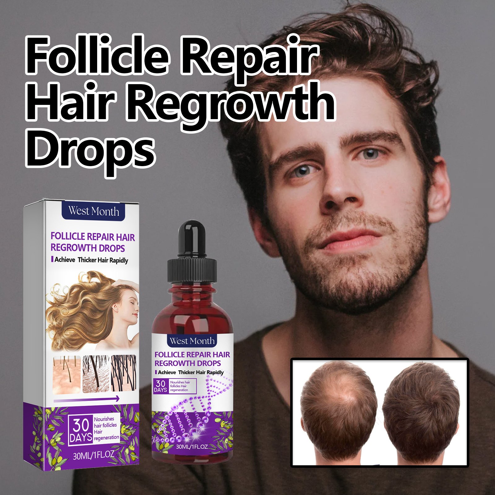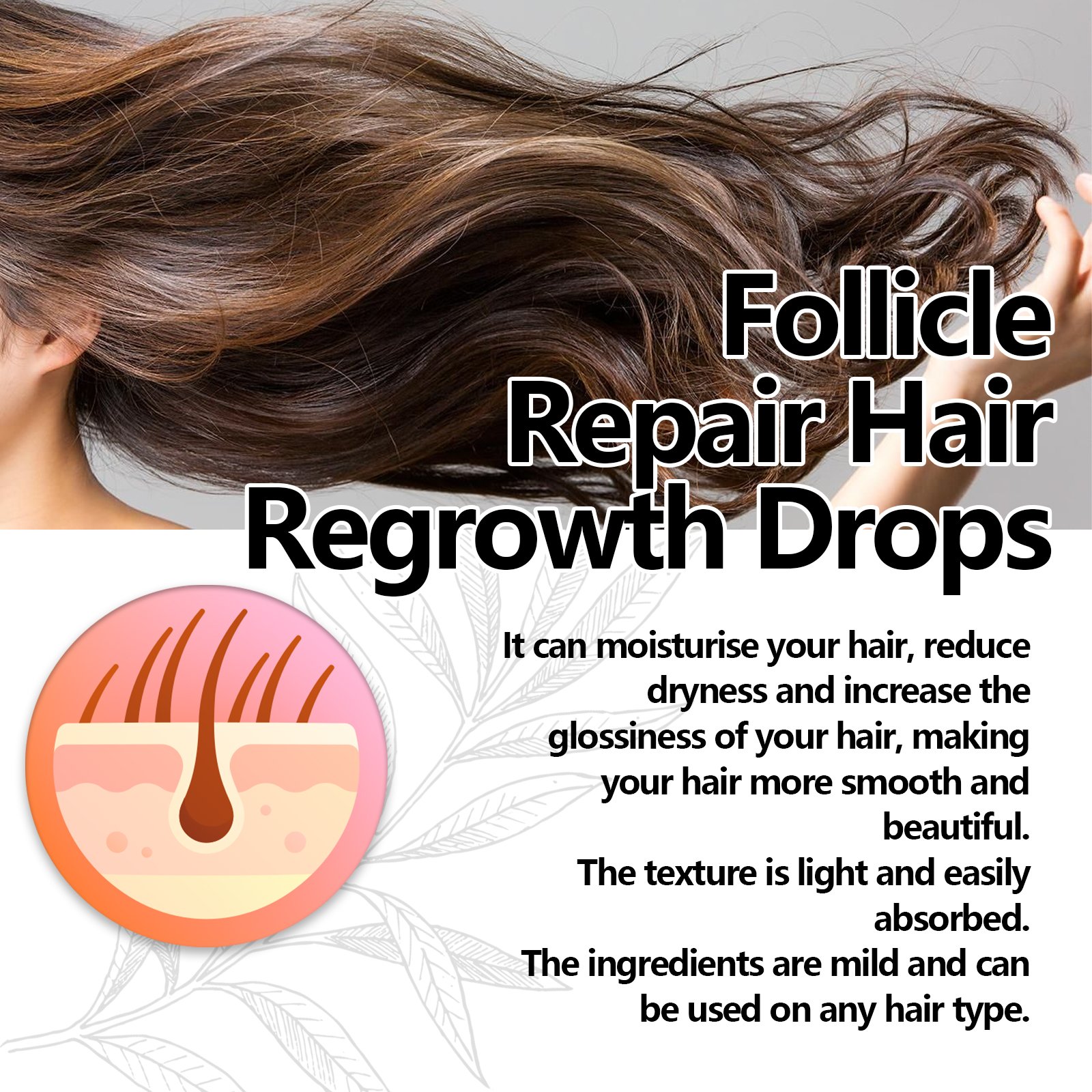 Our Month Follicle Repair Hair Regrowth Drops contains glycerin, ginger extract, and Centella asiatica extract. It can effectively strengthen the roots and lush hair, keep the hair healthy, can moisturize the hair, reduce dryness, and make your hair smoother and more beautiful. Its application method is very simple: use a dropper, take an appropriate amount of essence evenly drop on the scalp, gently massage until completely absorbed. Effectively strengthens hair roots and luxuriant hair so you can maintain healthy hair.