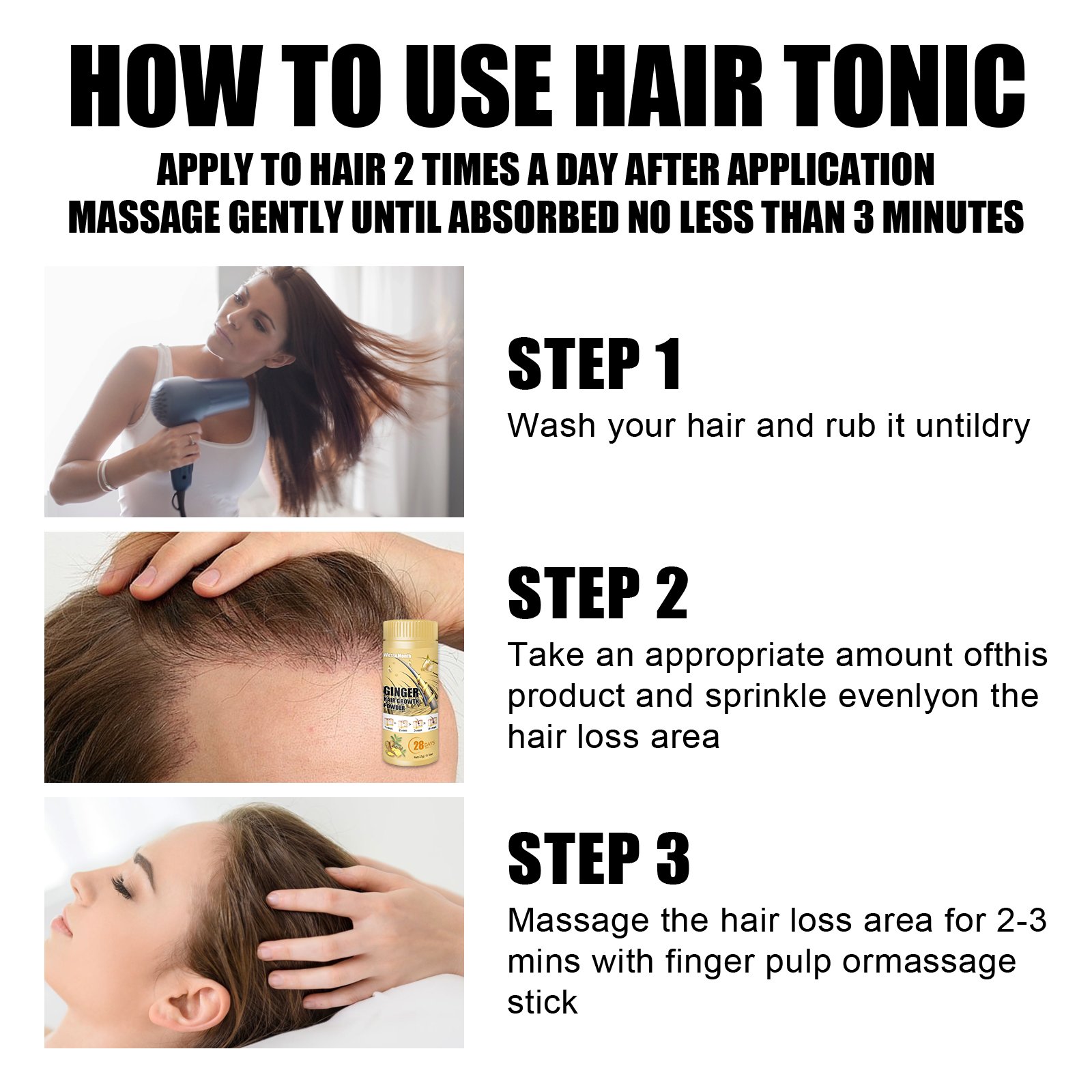 Our ginger powder contains ginger. It can control oil, protect hair and nourish scalp. Its use method is very simple: first wash the hair, rub until the hair is dry, then take an appropriate amount of this product evenly sprinkle on the hair loss area, and finally massage the hair loss area with the finger or massage stick for 2-3 minutes. And can grow and care for hair.