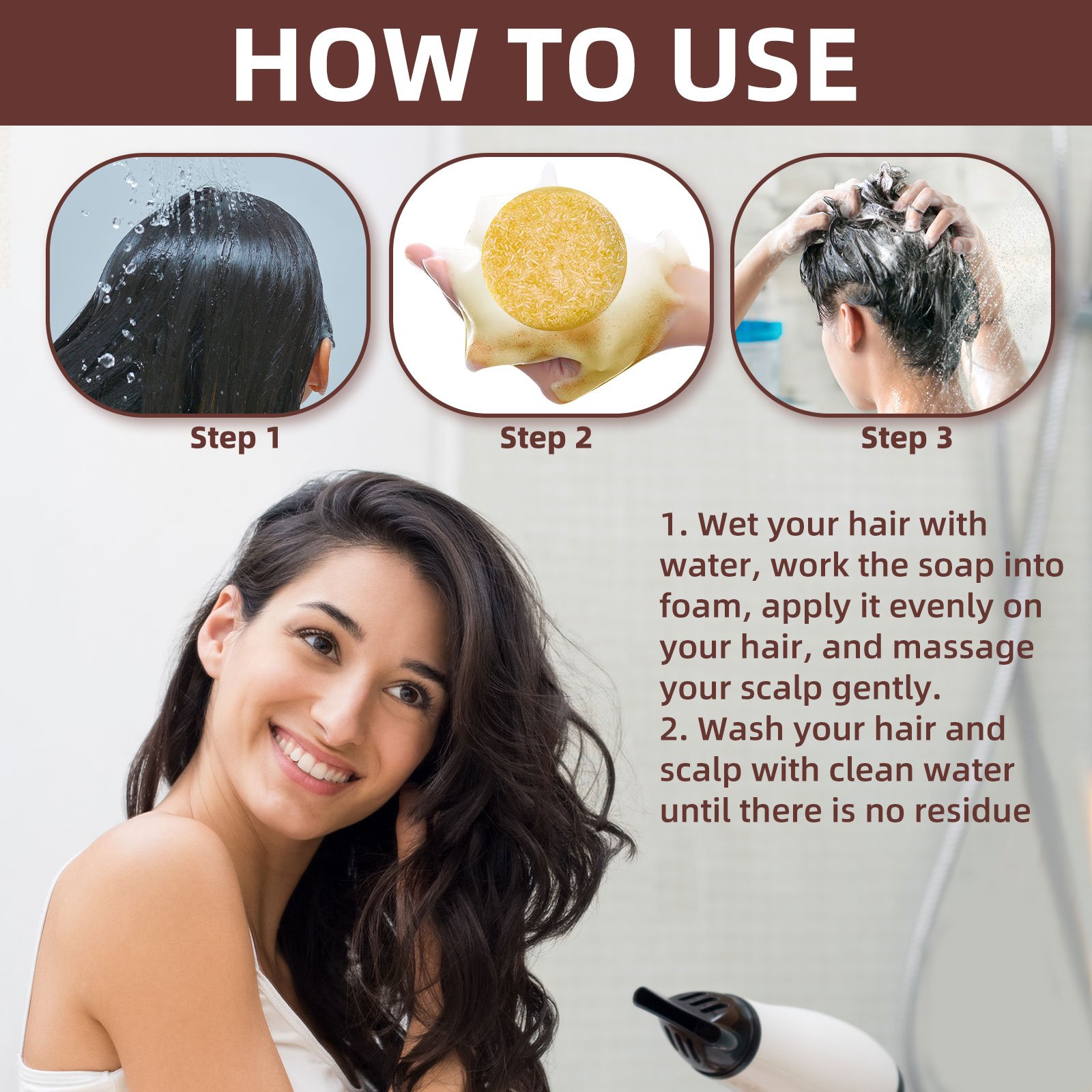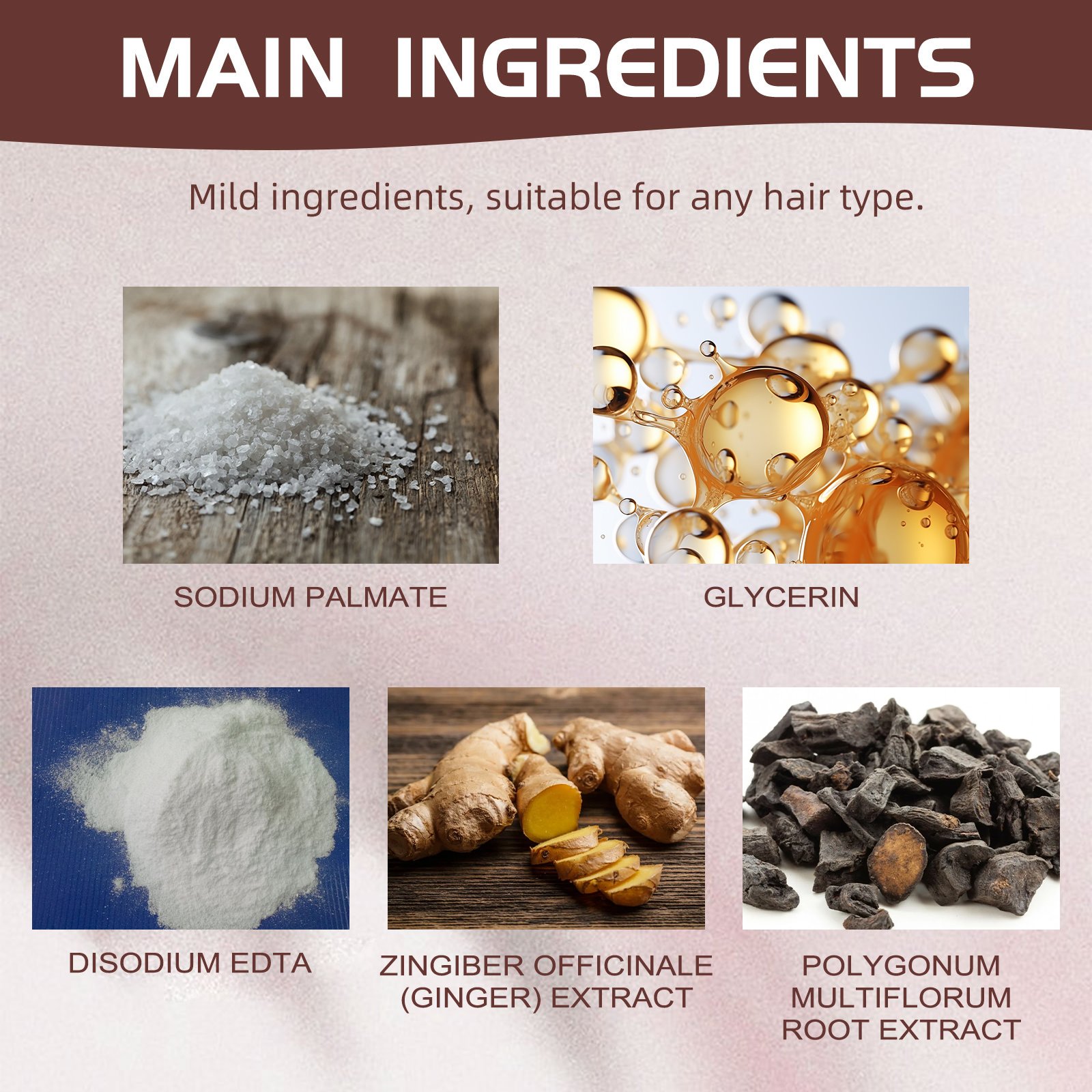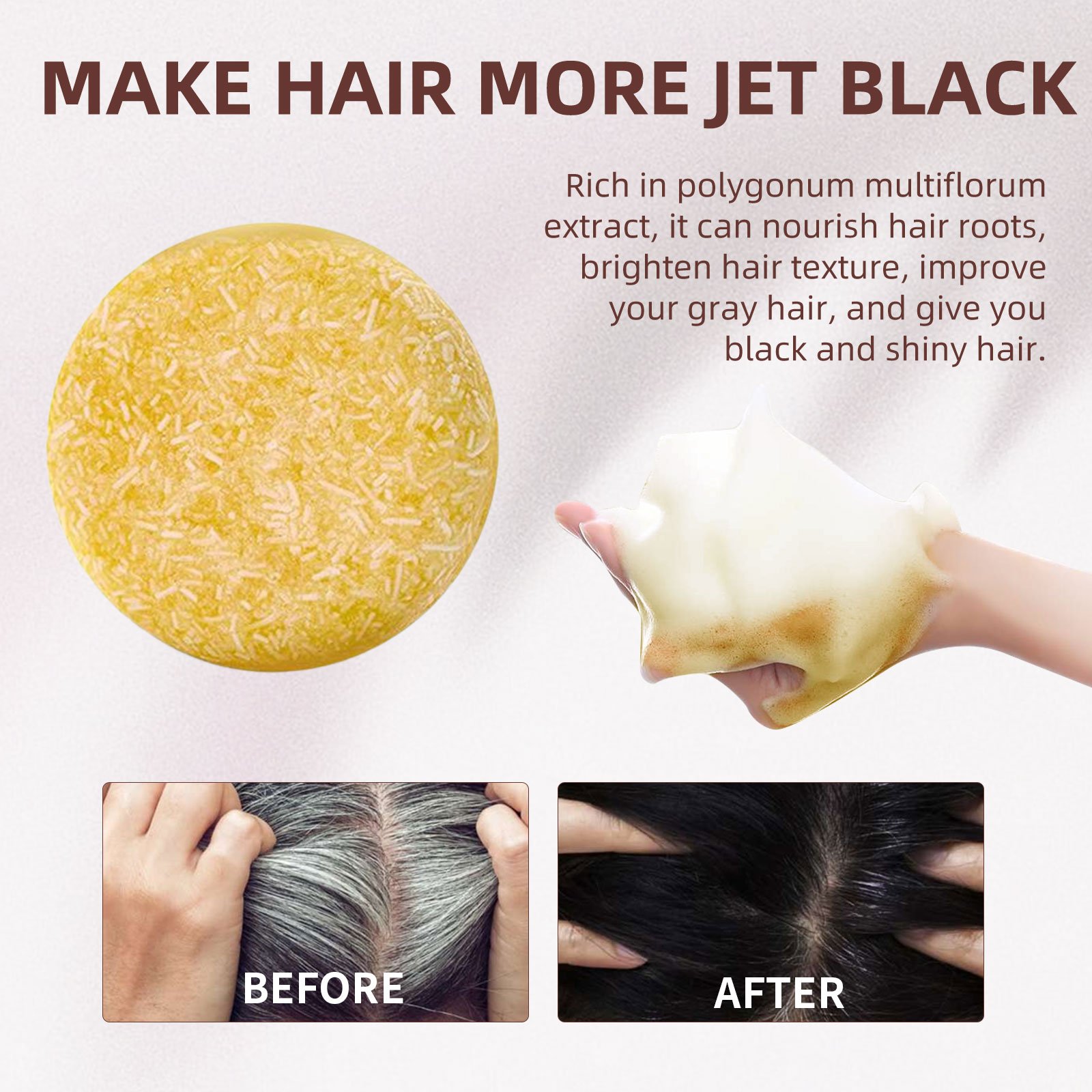 Our ginger soap contains sodium palmitate and glycerin. It nourishes and protects the hair, improves the health of hair follicles, promotes hair growth, moisturizes the roots, brightens the hair, covers your white hair, and gives you glossy black hair. Its application method is very simple: wet the hair with water, lather the soap, evenly apply it to the hair, gently massage the scalp, and finally clean the hair and scalp with clear water until there is no residue. It can deeply nourish hair roots, effectively control oil, and make hair look more fluffy and shiny.