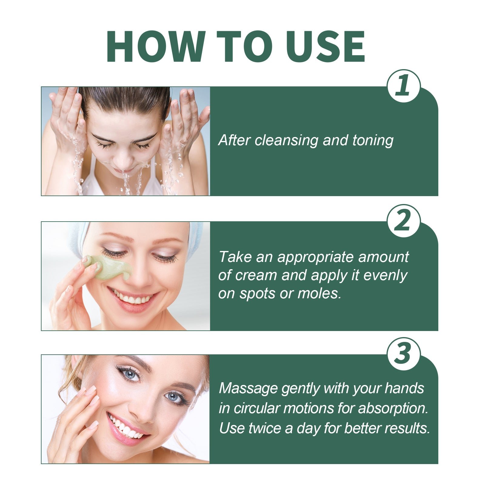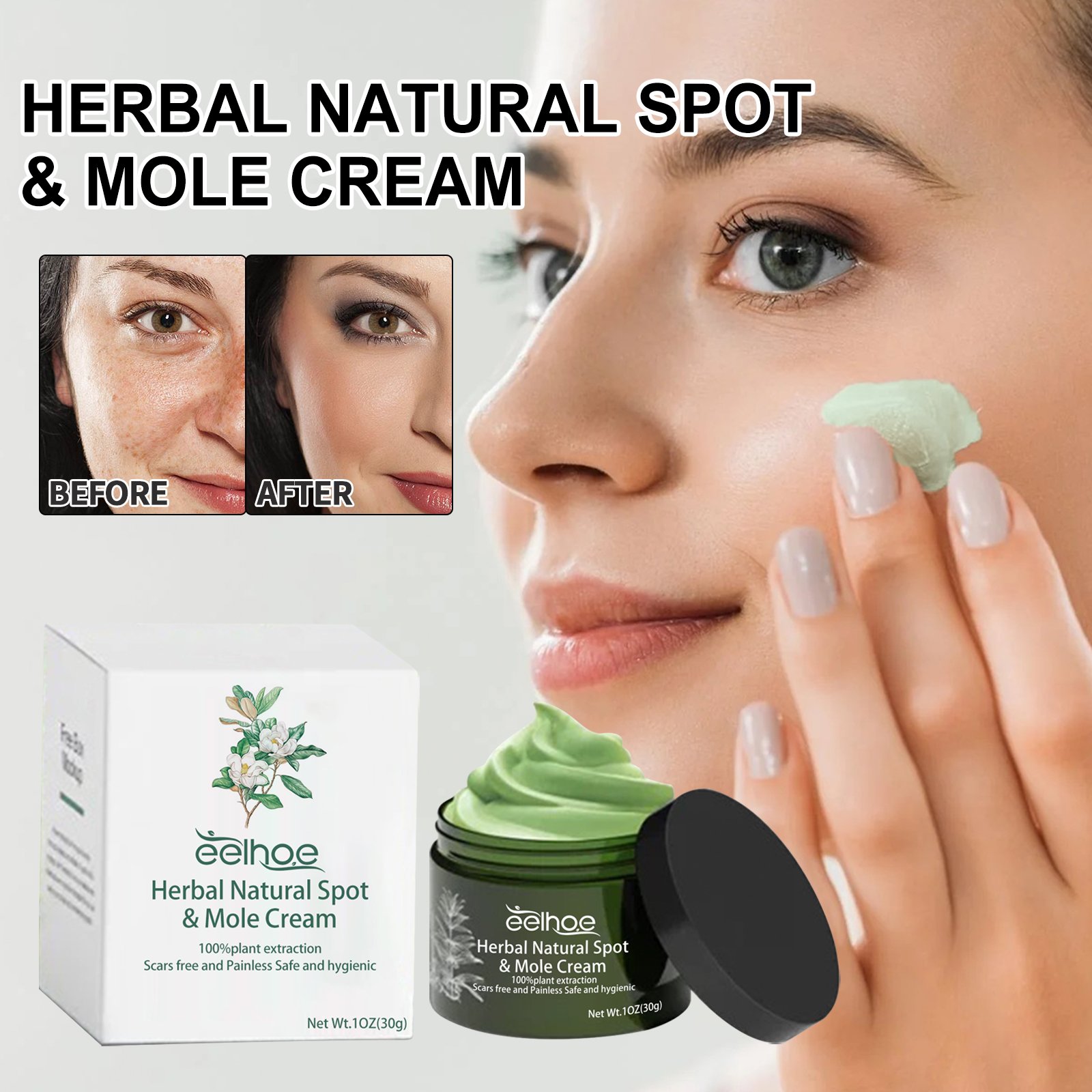 Our Herbal Natural Spot & Mole Cream contains ginseng extract, sophora japonica root extract, Phellodendron cypress extract. It can replenish the skin with necessary moisture and nutrients, make the skin converge faster and relieve discomfort, allowing the skin tone to gradually return to an even and fair complexion. Its application method is very simple: After cleansing and toning, take an appropriate amount of cream and apply it evenly on spots or moles, massage gently with your hands in circular motions for absorption. Naturally lighten and fall off spots, moles and skin tags, and restore skin’s even luster.
