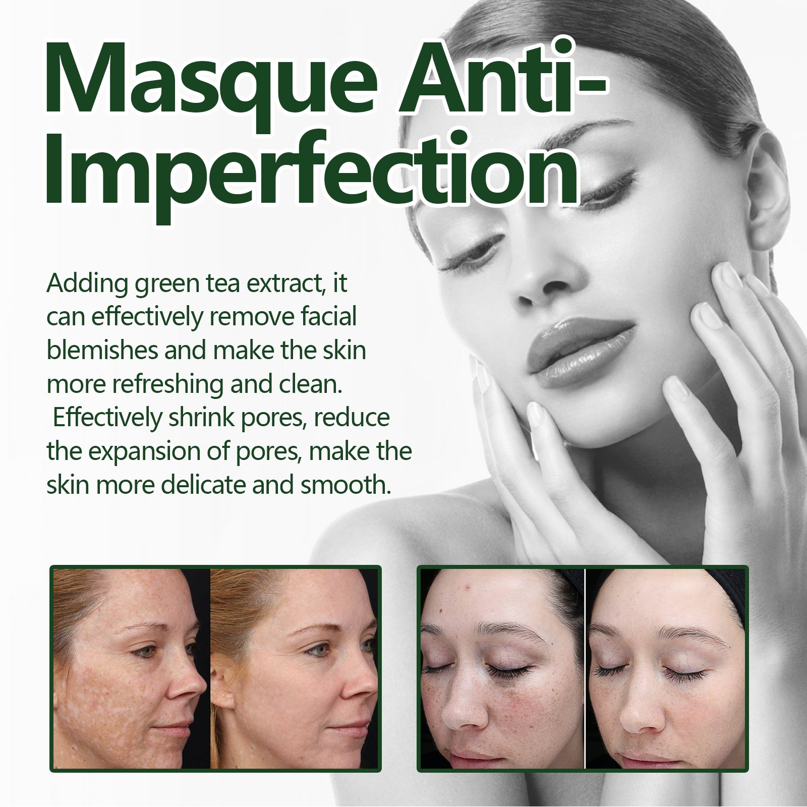 Our Masque Anti-Imperfection contain glycerin, green tea extract, vitamin E. It can effectively remove facial blemishes, make skin more fresh and clean, effectively shrink pores, reduce pore expansion, and make skin more delicate and smooth. The way to use it is very simple: apply the product evenly on your face, let it sit for 15 minutes, and then rinse it off with water. Can effectively reduce pimples, improve skin texture and appearance Regular use can improve dull skin, brighten complexion and make you look younger.