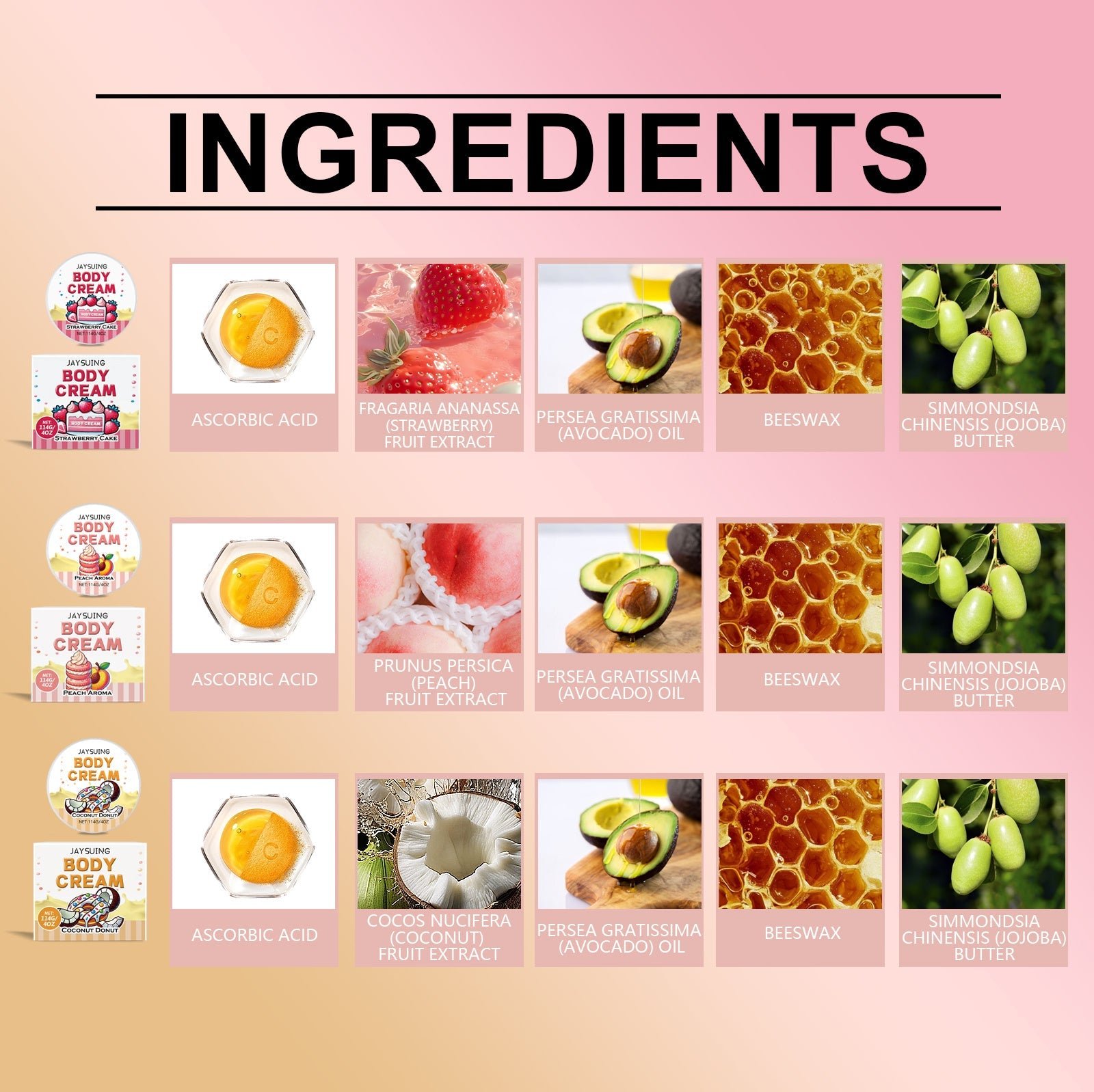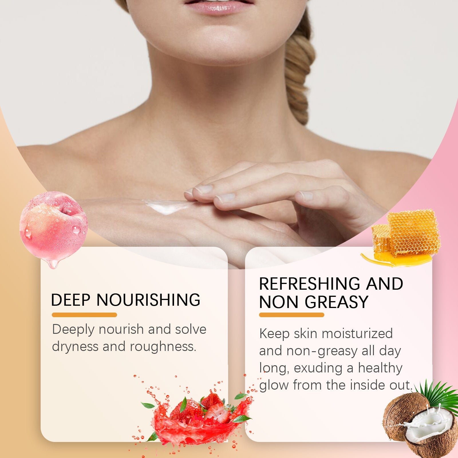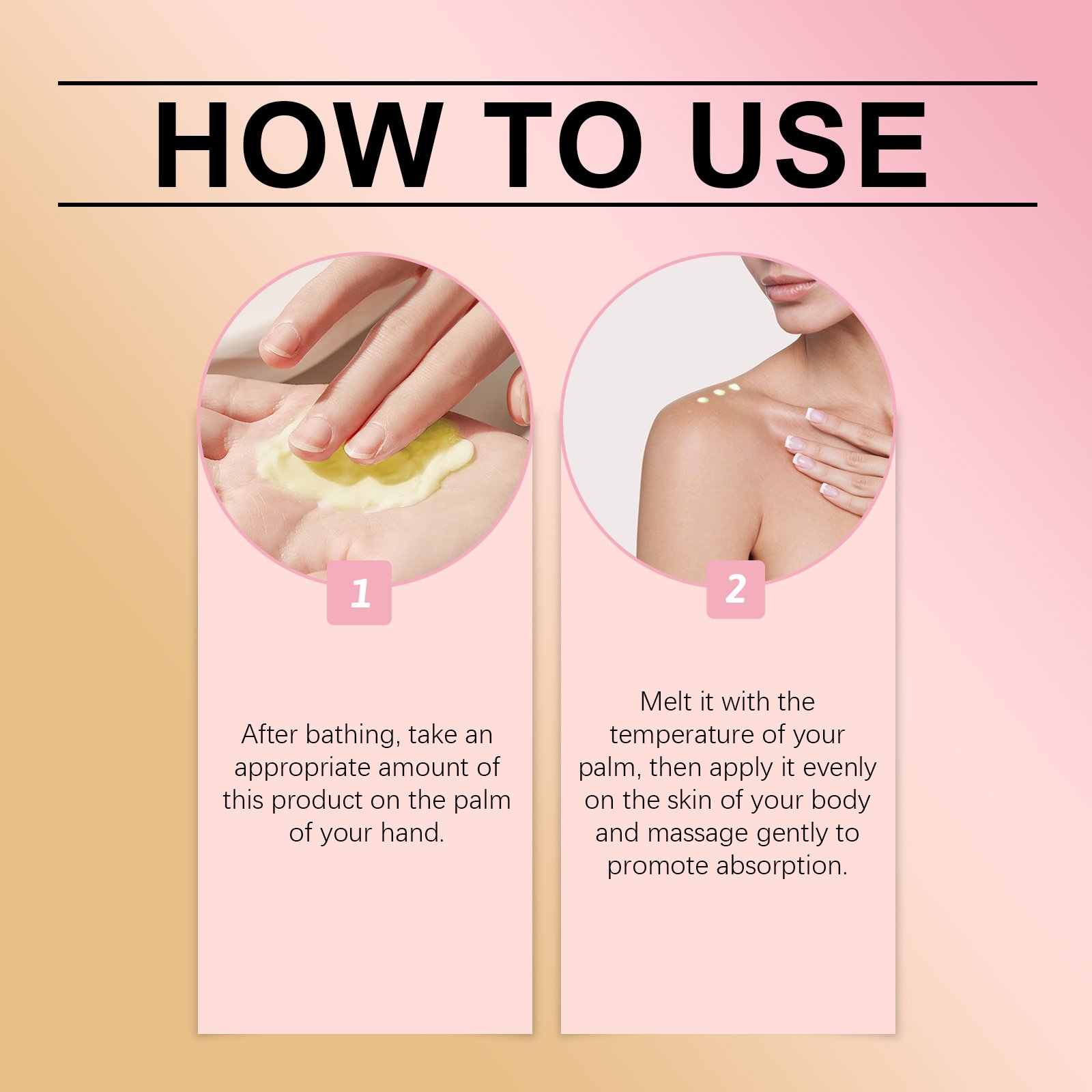 Our peach Macaron body milk contains beeswax and Jojoba oil. It can be designed for the whole body to penetrate deeply, lock in moisture for a long time, solve dry problems, and restore skin tenderness and elasticity. Its use method is very simple: after bathing, take appropriate amount of this product on the palm, melt with the palm temperature and evenly apply on the skin of the body, gently massage to promote absorption. It also keeps the skin moisturized and non-greasy throughout the day, giving off a healthy glow from the inside out