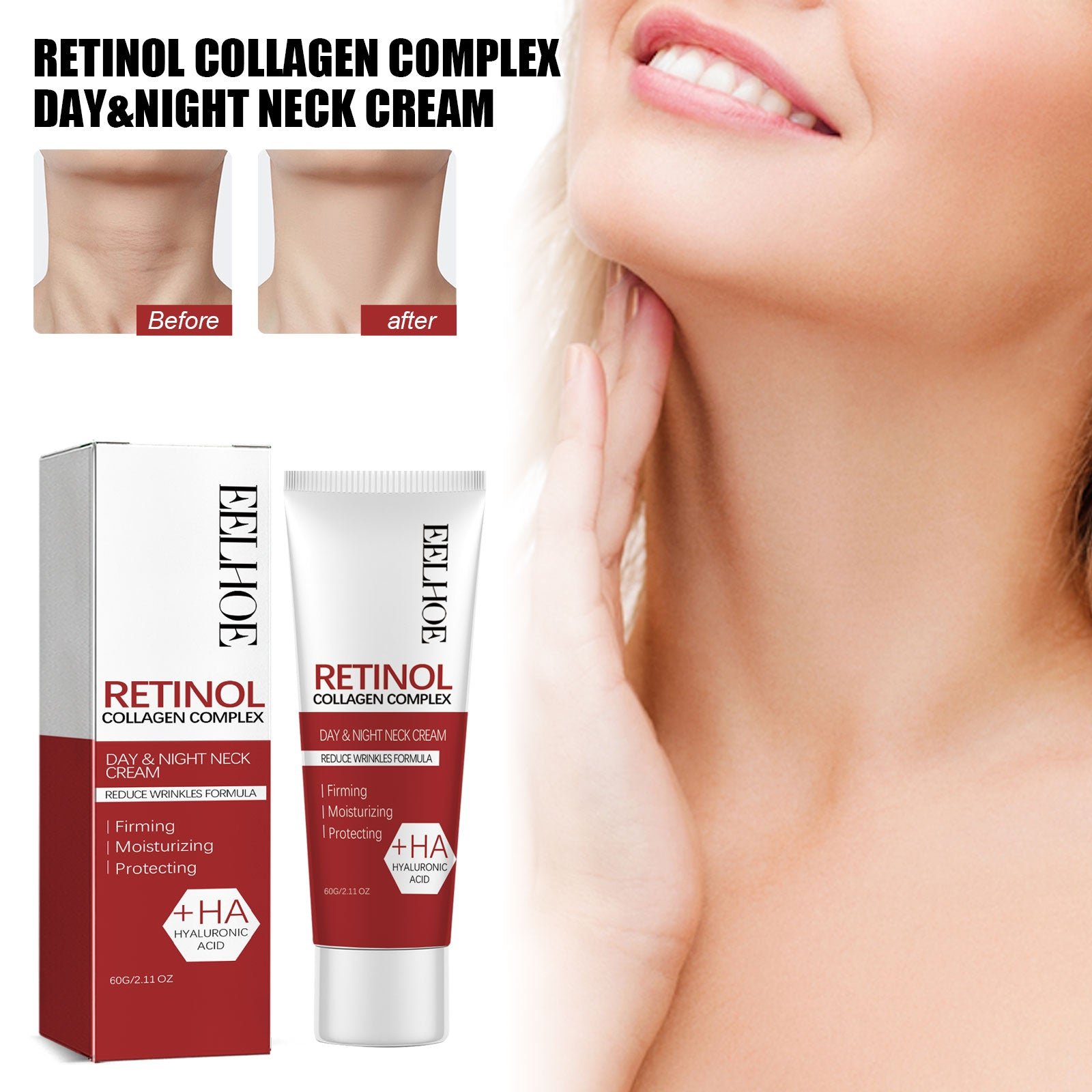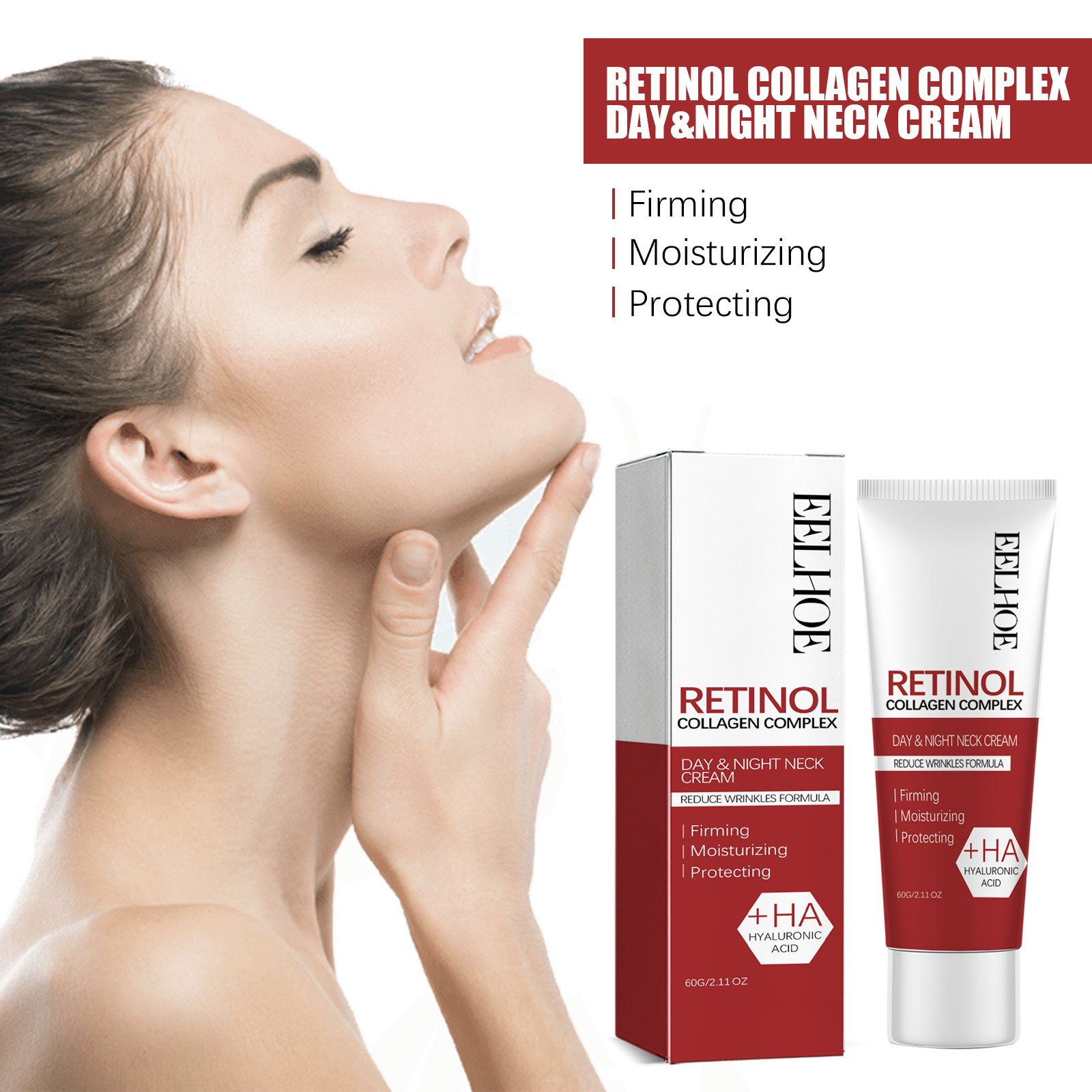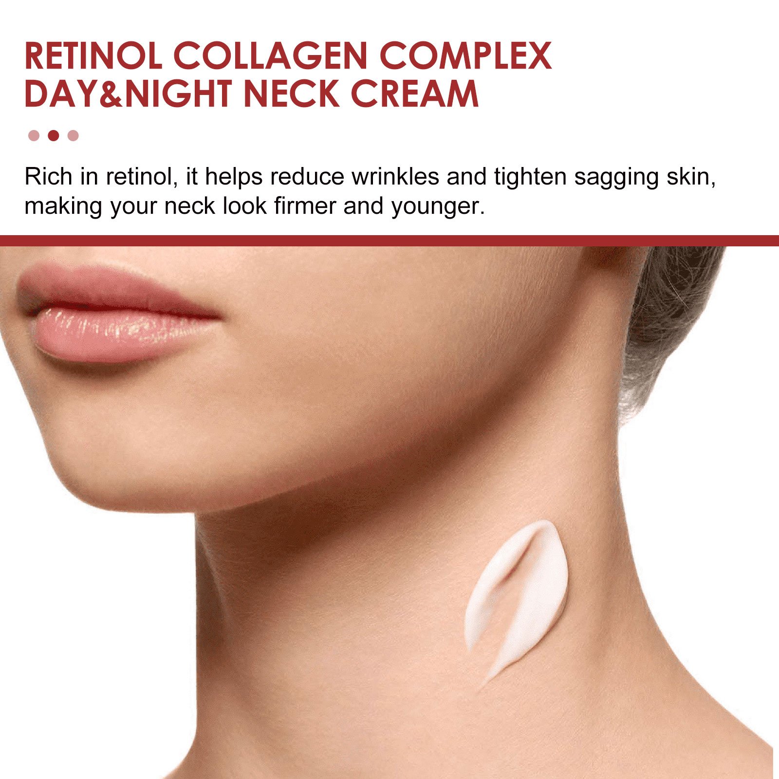 Our Retinol Collagen Complex Day&Night Neck Cream contains retinol, vitamin C and Glycyrrhiza glabra root extract. It can effectively combat wrinkles, fine lines, uneven skin tone, rough texture and skin tightness and other problems, increase skin elasticity, promote collagen production, stimulate skin cell renewal, nourish skin, whitening and moisturizing. Its use method is very simple: after cleaning the neck, apply an appropriate amount of this product evenly on the neck, and then gently massage with the fingertips until it is completely absorbed. It can effectively reduce wrinkles, tighten saggy skin, and make your neck look firmer and more youthful.
