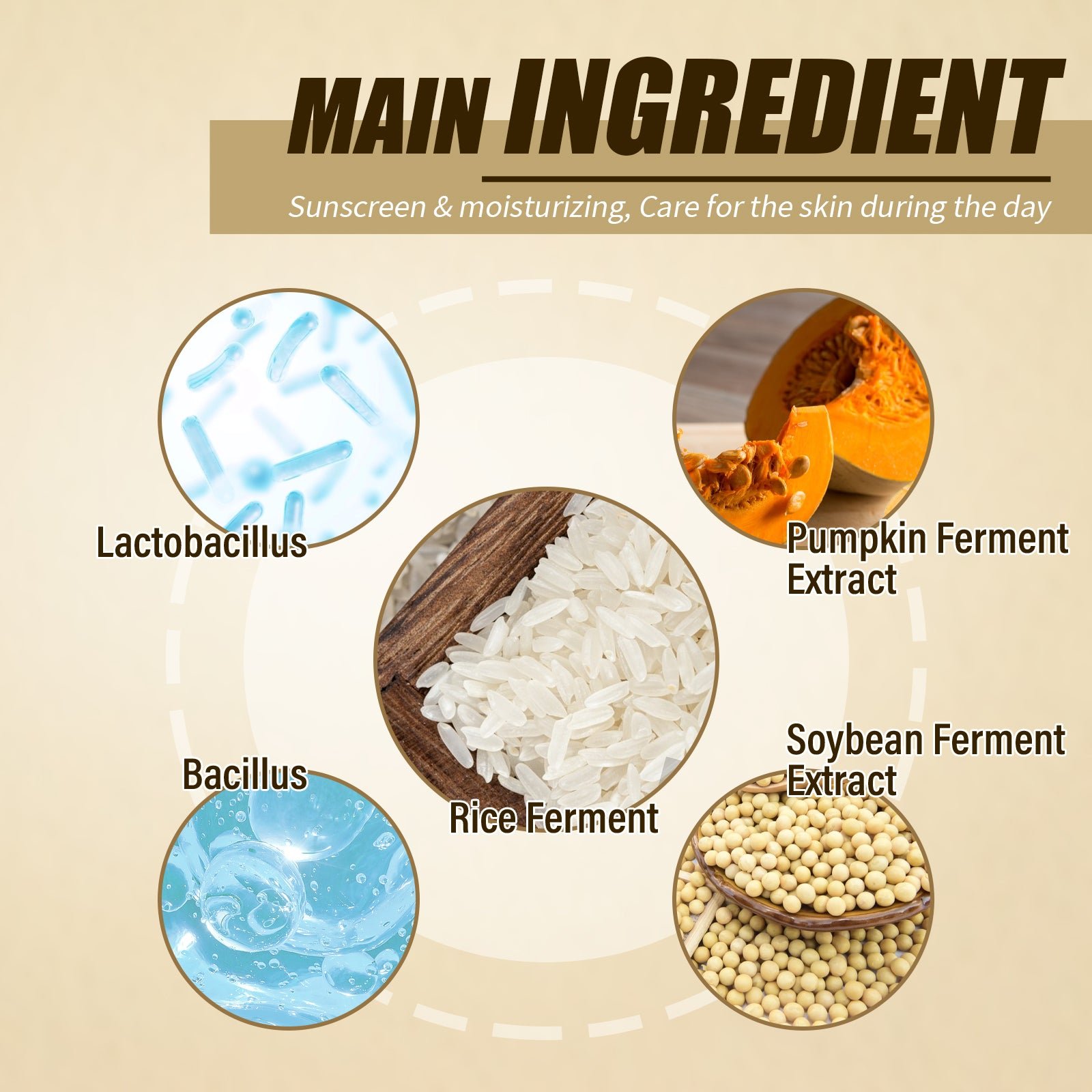 Our Rice Probiotic protective cream contains pumpkin fermentation extract, rice fermentation broth, Lactobacillus. It protects the skin from the sun, moisturizes the texture, is waterproof and sweat resistant, moisturizes the skin, and is easy to apply, and the skin feels comfortable after applying. The way to use it is simple: First, 15 to 20 minutes before departure, apply a moderate amount of sunscreen, then evenly apply to the face and neck. Apply makeup before applying it if necessary. If you are exposed to prolonged sun exposure, you need to apply it promptly. After use, it is moist, refreshing and non-greasy, naturally moisturizes the skin, makes you feel very light, protects your skin from UV damage, and keeps the skin white.