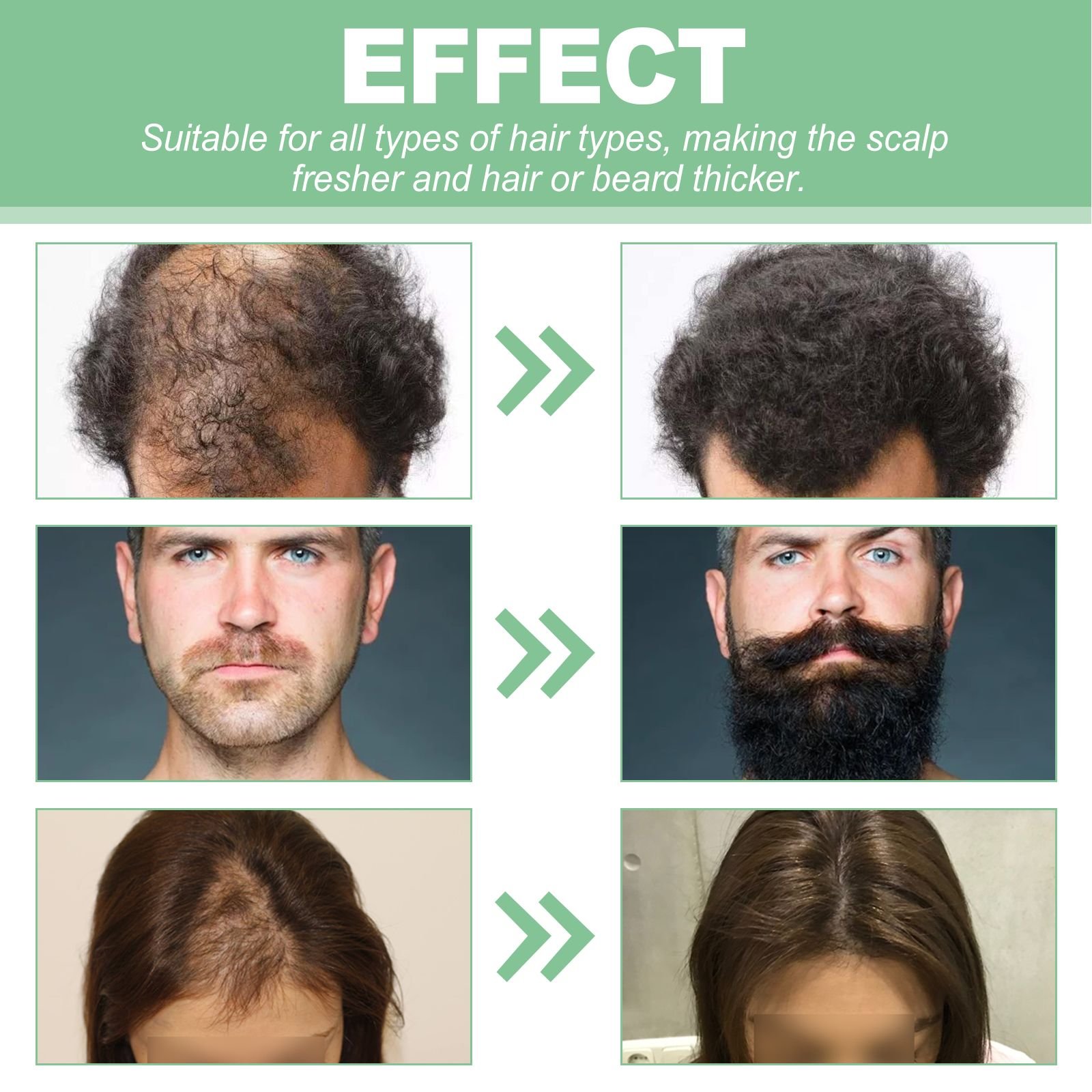 Our dense hair roller contains rosemary oil, glycerin, coconut oil.It cleanses the scalp, controls oil secretion and prevents excessive oil secretion from clogging hair follicles.It helps hair growth nourishes hair roots, improves hair health and repairs damaged hair.It is easy to use: first clean your hair or beard, blow dry and squeeze out the right amount of serum and apply it to the affected area with a roller ball.Massage the scalp with the ball for 2-3 minutes until the product is absorbed (no need to rinse), and use once a day in the morning and evening for best results.Stimulates hair follicles, strengthens hair roots, promotes hair growth and smoothes hair for thicker, darker hair.